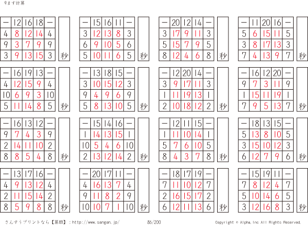 上記のボタンから「9ます引き算(3マス×3マス)」の算数数学ドリル・計算ドリル(PDFプリント)がダウンロードできます。個人利用は無料です(家庭以外での配布は有料です)。