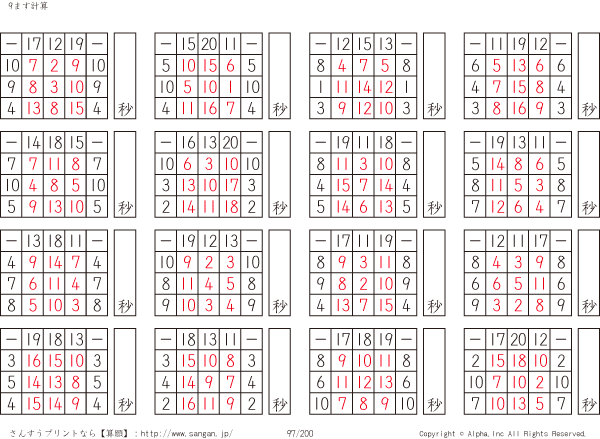 上記のボタンから「9ます引き算(3マス×3マス)」の算数数学ドリル・計算ドリル(PDFプリント)がダウンロードできます。個人利用は無料です(家庭以外での配布は有料です)。
