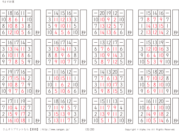 上記のボタンから「9ます引き算(3マス×3マス)」の算数数学ドリル・計算ドリル(PDFプリント)がダウンロードできます。個人利用は無料です(家庭以外での配布は有料です)。