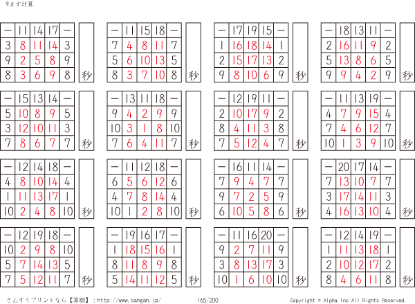 上記のボタンから「9ます引き算(3マス×3マス)」の算数数学ドリル・計算ドリル(PDFプリント)がダウンロードできます。個人利用は無料です(家庭以外での配布は有料です)。