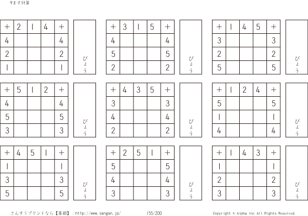 上記のボタンから「9ます足し算くりあがりなし(3マス×3マス)」の算数数学ドリル・計算ドリル(PDFプリント)がダウンロードできます。個人利用は無料です(家庭以外での配布は有料です)。