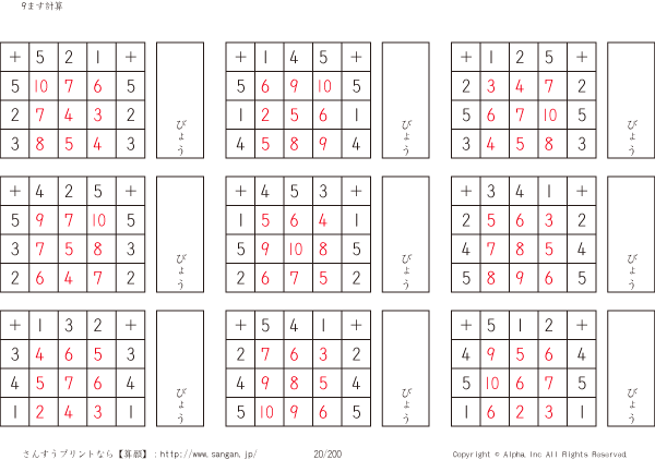 9ます足し算くりあがりなし(3マス×3マス) [解答]020/200