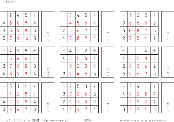 9ます足し算くりあがりなし(3マス×3マス) [解答]029/200