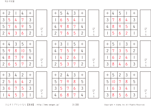 9ます足し算くりあがりなし(3マス×3マス) [解答]031/200