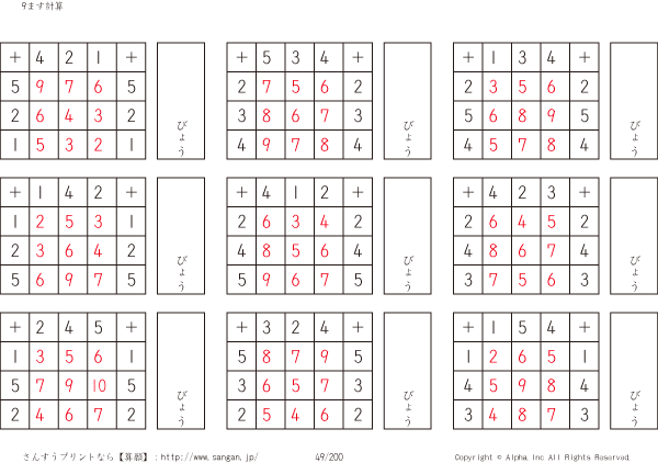 9ます足し算くりあがりなし(3マス×3マス) [解答]049/200
