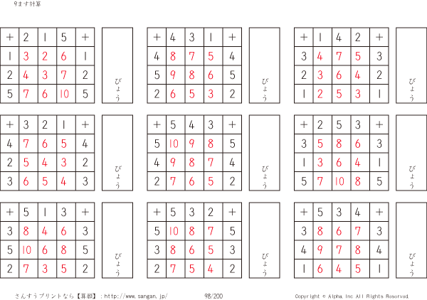 9ます足し算くりあがりなし(3マス×3マス) [解答]098/200