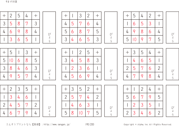 9ます足し算くりあがりなし(3マス×3マス) [解答]190/200