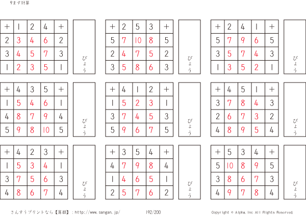 9ます足し算くりあがりなし(3マス×3マス) [解答]192/200