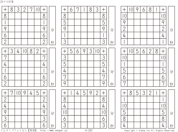 上記のボタンから「25ます足し算(5マス×5マス)」の算数数学ドリル・計算ドリル(PDFプリント)がダウンロードできます。個人利用は無料です(家庭以外での配布は有料です)。