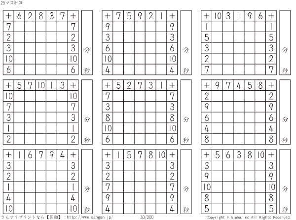 上記のボタンから「25ます足し算(5マス×5マス)」の算数数学ドリル・計算ドリル(PDFプリント)がダウンロードできます。個人利用は無料です(家庭以外での配布は有料です)。