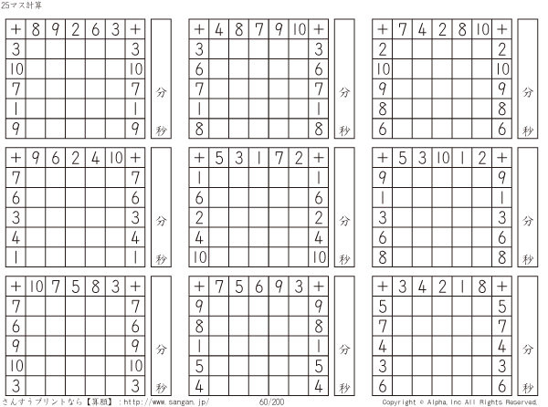 上記のボタンから「25ます足し算(5マス×5マス)」の算数数学ドリル・計算ドリル(PDFプリント)がダウンロードできます。個人利用は無料です(家庭以外での配布は有料です)。