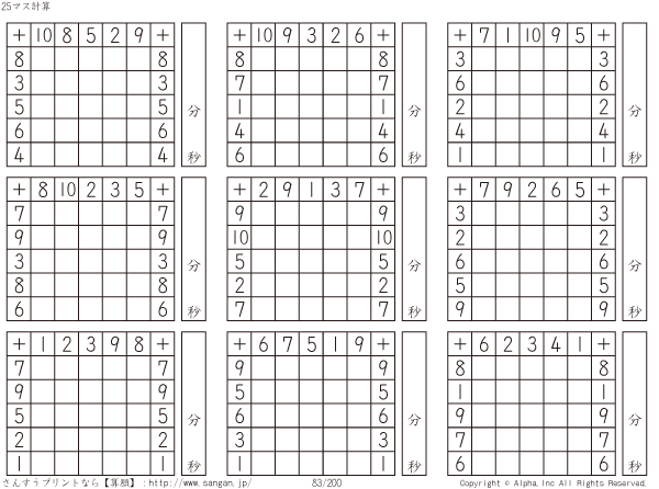 上記のボタンから「25ます足し算(5マス×5マス)」の算数数学ドリル・計算ドリル(PDFプリント)がダウンロードできます。個人利用は無料です(家庭以外での配布は有料です)。
