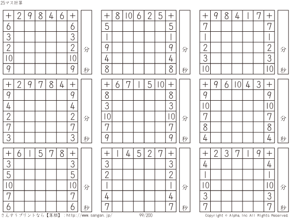 上記のボタンから「25ます足し算(5マス×5マス)」の算数数学ドリル・計算ドリル(PDFプリント)がダウンロードできます。個人利用は無料です(家庭以外での配布は有料です)。