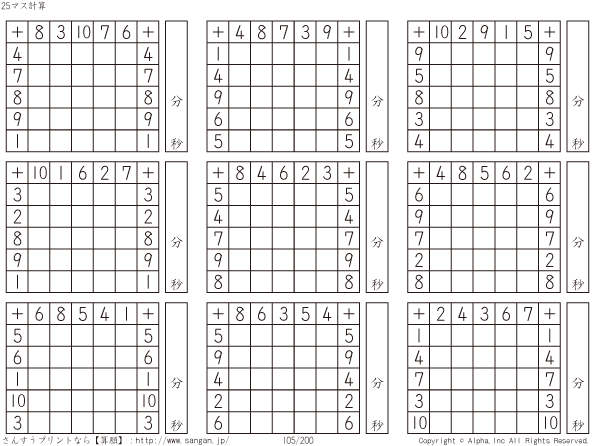 25ます足し算(5マス×5マス) [問題]105/200