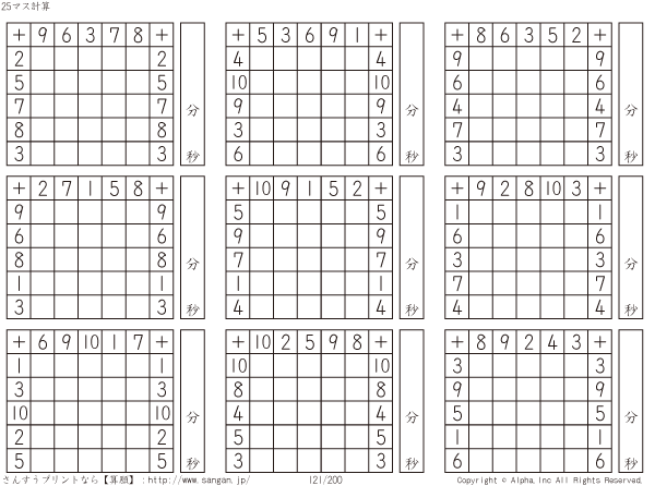 上記のボタンから「25ます足し算(5マス×5マス)」の算数数学ドリル・計算ドリル(PDFプリント)がダウンロードできます。個人利用は無料です(家庭以外での配布は有料です)。