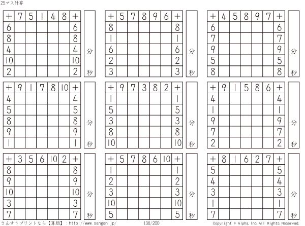 上記のボタンから「25ます足し算(5マス×5マス)」の算数数学ドリル・計算ドリル(PDFプリント)がダウンロードできます。個人利用は無料です(家庭以外での配布は有料です)。
