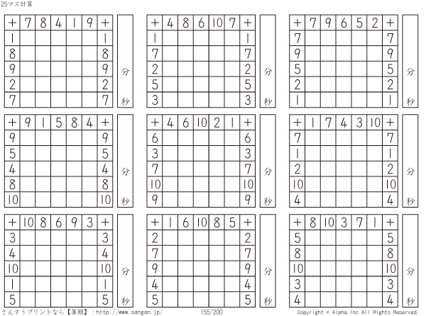 上記のボタンから「25ます足し算(5マス×5マス)」の算数数学ドリル・計算ドリル(PDFプリント)がダウンロードできます。個人利用は無料です(家庭以外での配布は有料です)。