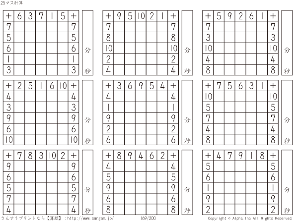 上記のボタンから「25ます足し算(5マス×5マス)」の算数数学ドリル・計算ドリル(PDFプリント)がダウンロードできます。個人利用は無料です(家庭以外での配布は有料です)。