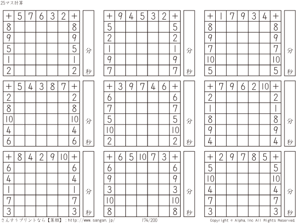 上記のボタンから「25ます足し算(5マス×5マス)」の算数数学ドリル・計算ドリル(PDFプリント)がダウンロードできます。個人利用は無料です(家庭以外での配布は有料です)。