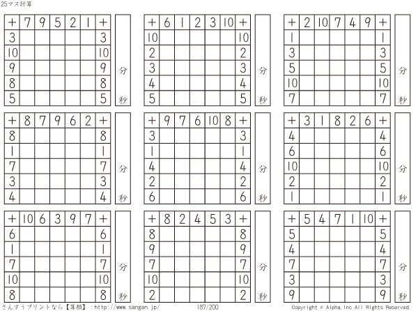 上記のボタンから「25ます足し算(5マス×5マス)」の算数数学ドリル・計算ドリル(PDFプリント)がダウンロードできます。個人利用は無料です(家庭以外での配布は有料です)。