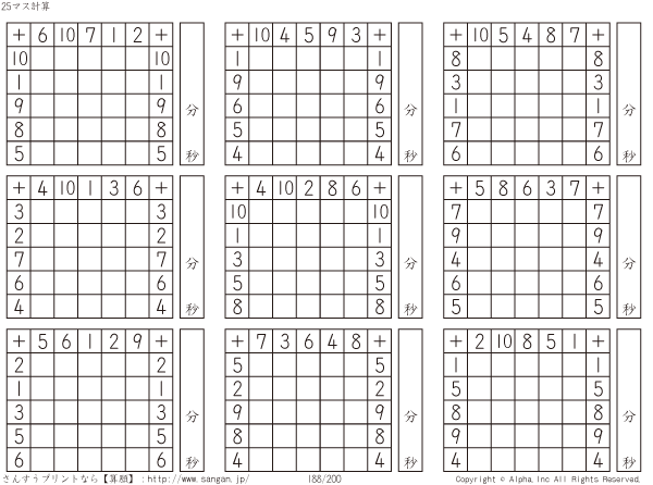 上記のボタンから「25ます足し算(5マス×5マス)」の算数数学ドリル・計算ドリル(PDFプリント)がダウンロードできます。個人利用は無料です(家庭以外での配布は有料です)。