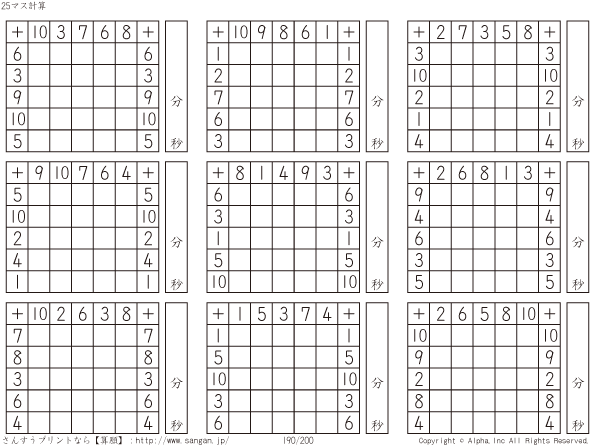 25ます足し算(5マス×5マス) [問題]190/200