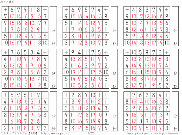 上記のボタンから「25ます足し算(5マス×5マス)」の算数数学ドリル・計算ドリル(PDFプリント)がダウンロードできます。個人利用は無料です(家庭以外での配布は有料です)。