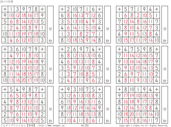 25ます足し算(5マス×5マス) [解答]046/200