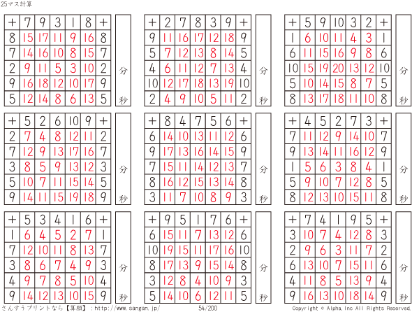 上記のボタンから「25ます足し算(5マス×5マス)」の算数数学ドリル・計算ドリル(PDFプリント)がダウンロードできます。個人利用は無料です(家庭以外での配布は有料です)。