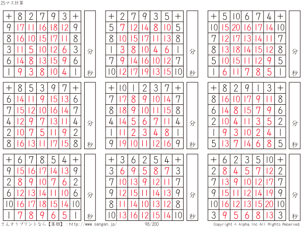 上記のボタンから「25ます足し算(5マス×5マス)」の算数数学ドリル・計算ドリル(PDFプリント)がダウンロードできます。個人利用は無料です(家庭以外での配布は有料です)。