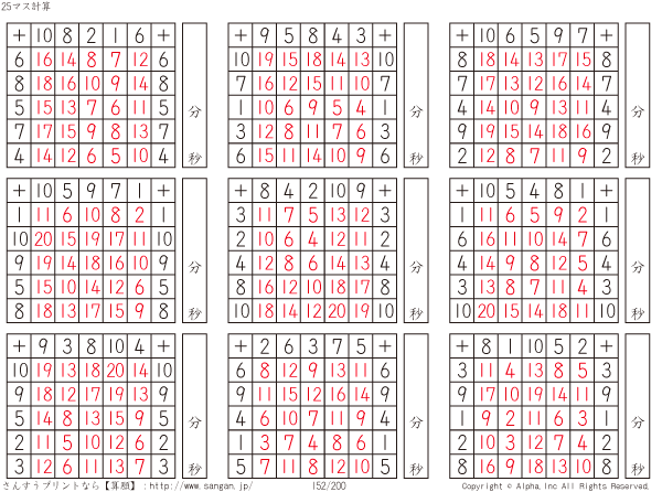 上記のボタンから「25ます足し算(5マス×5マス)」の算数数学ドリル・計算ドリル(PDFプリント)がダウンロードできます。個人利用は無料です(家庭以外での配布は有料です)。