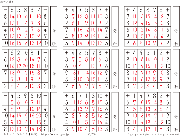 上記のボタンから「25ます足し算(5マス×5マス)」の算数数学ドリル・計算ドリル(PDFプリント)がダウンロードできます。個人利用は無料です(家庭以外での配布は有料です)。