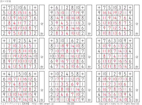 上記のボタンから「25ます足し算(5マス×5マス)」の算数数学ドリル・計算ドリル(PDFプリント)がダウンロードできます。個人利用は無料です(家庭以外での配布は有料です)。