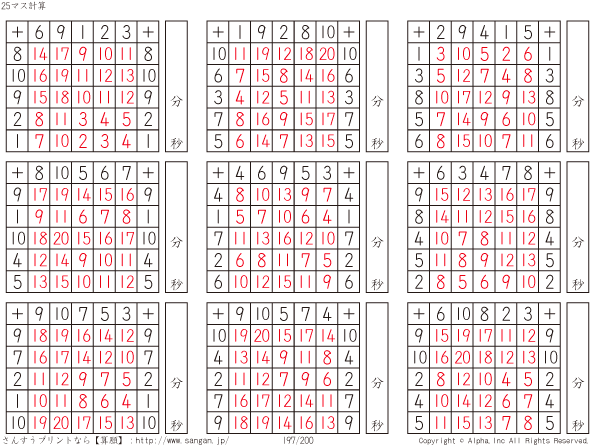 25ます足し算(5マス×5マス) [解答]197/200