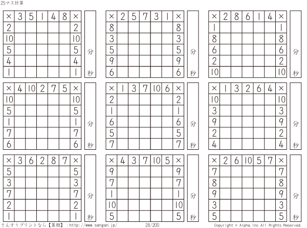 上記のボタンから「25ます掛け算(5マス×5マス)」の算数数学ドリル・計算ドリル(PDFプリント)がダウンロードできます。個人利用は無料です(家庭以外での配布は有料です)。