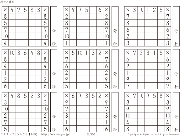 上記のボタンから「25ます掛け算(5マス×5マス)」の算数数学ドリル・計算ドリル(PDFプリント)がダウンロードできます。個人利用は無料です(家庭以外での配布は有料です)。
