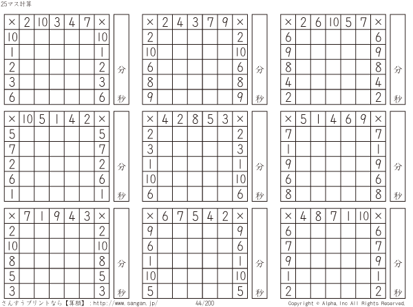 上記のボタンから「25ます掛け算(5マス×5マス)」の算数数学ドリル・計算ドリル(PDFプリント)がダウンロードできます。個人利用は無料です(家庭以外での配布は有料です)。