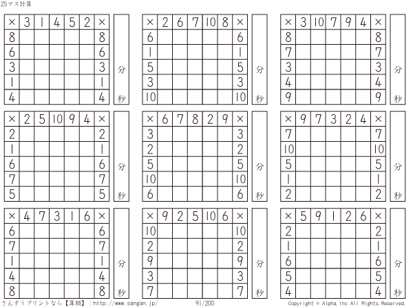 上記のボタンから「25ます掛け算(5マス×5マス)」の算数数学ドリル・計算ドリル(PDFプリント)がダウンロードできます。個人利用は無料です(家庭以外での配布は有料です)。