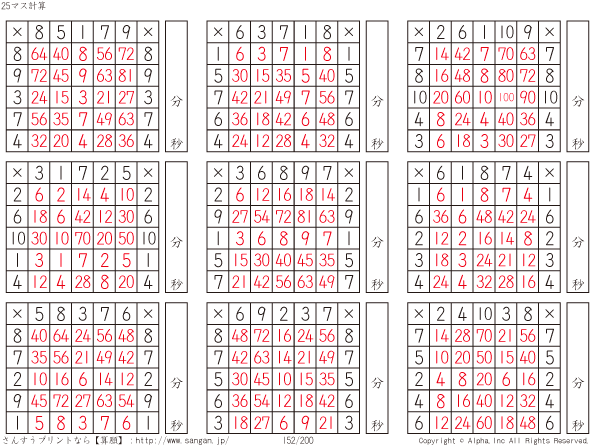 25ます掛け算(5マス×5マス) [解答]152/200