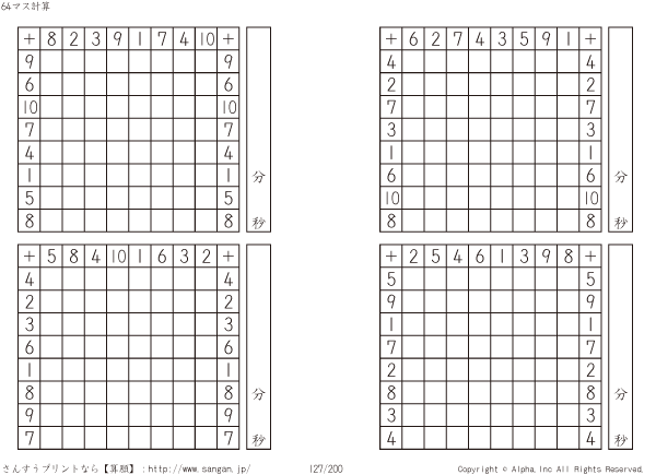 上記のボタンから「64ます足し算(8マス×8マス)」の算数数学ドリル・計算ドリル(PDFプリント)がダウンロードできます。個人利用は無料です(家庭以外での配布は有料です)。