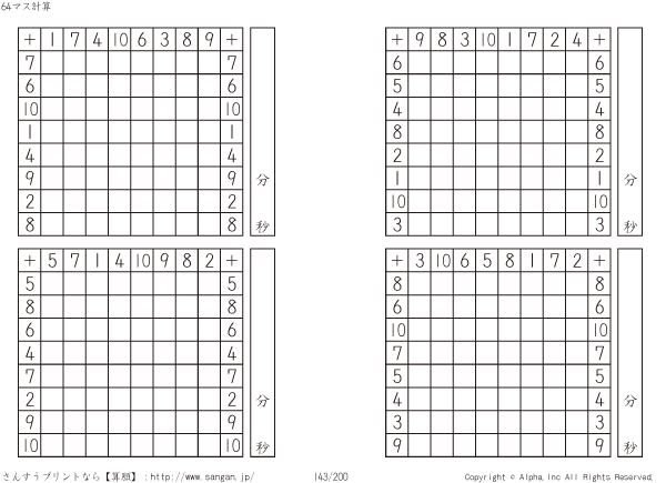 上記のボタンから「64ます足し算(8マス×8マス)」の算数数学ドリル・計算ドリル(PDFプリント)がダウンロードできます。個人利用は無料です(家庭以外での配布は有料です)。