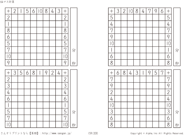 上記のボタンから「64ます足し算(8マス×8マス)」の算数数学ドリル・計算ドリル(PDFプリント)がダウンロードできます。個人利用は無料です(家庭以外での配布は有料です)。