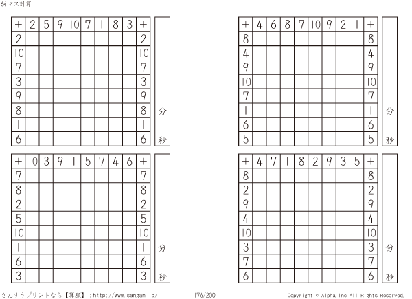上記のボタンから「64ます足し算(8マス×8マス)」の算数数学ドリル・計算ドリル(PDFプリント)がダウンロードできます。個人利用は無料です(家庭以外での配布は有料です)。