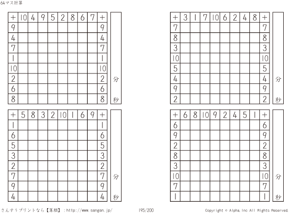 上記のボタンから「64ます足し算(8マス×8マス)」の算数数学ドリル・計算ドリル(PDFプリント)がダウンロードできます。個人利用は無料です(家庭以外での配布は有料です)。