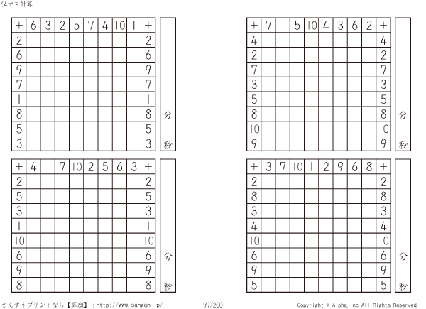 上記のボタンから「64ます足し算(8マス×8マス)」の算数数学ドリル・計算ドリル(PDFプリント)がダウンロードできます。個人利用は無料です(家庭以外での配布は有料です)。