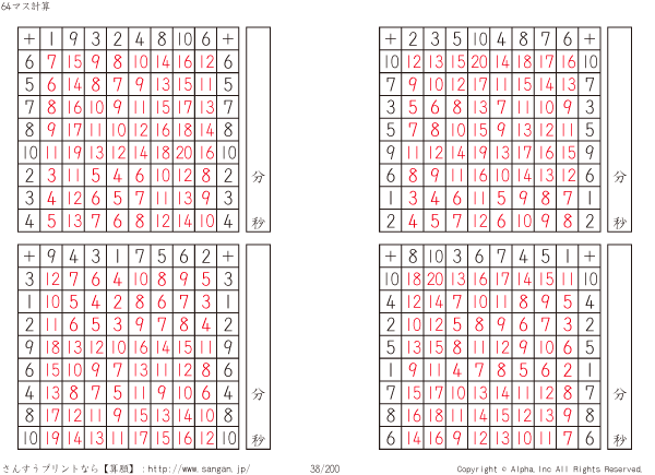 上記のボタンから「64ます足し算(8マス×8マス)」の算数数学ドリル・計算ドリル(PDFプリント)がダウンロードできます。個人利用は無料です(家庭以外での配布は有料です)。