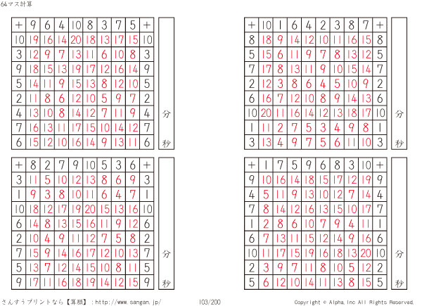 上記のボタンから「64ます足し算(8マス×8マス)」の算数数学ドリル・計算ドリル(PDFプリント)がダウンロードできます。個人利用は無料です(家庭以外での配布は有料です)。