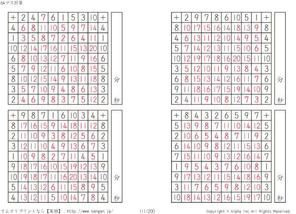 上記のボタンから「64ます足し算(8マス×8マス)」の算数数学ドリル・計算ドリル(PDFプリント)がダウンロードできます。個人利用は無料です(家庭以外での配布は有料です)。