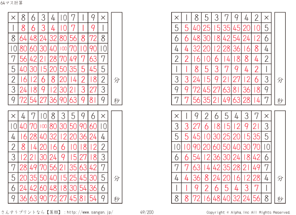 上記のボタンから「64ます掛け算(8マス×8マス)」の算数数学ドリル・計算ドリル(PDFプリント)がダウンロードできます。個人利用は無料です(家庭以外での配布は有料です)。