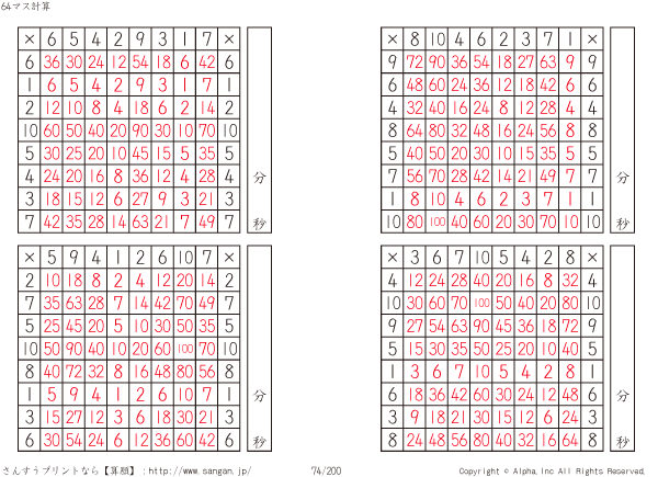 上記のボタンから「64ます掛け算(8マス×8マス)」の算数数学ドリル・計算ドリル(PDFプリント)がダウンロードできます。個人利用は無料です(家庭以外での配布は有料です)。